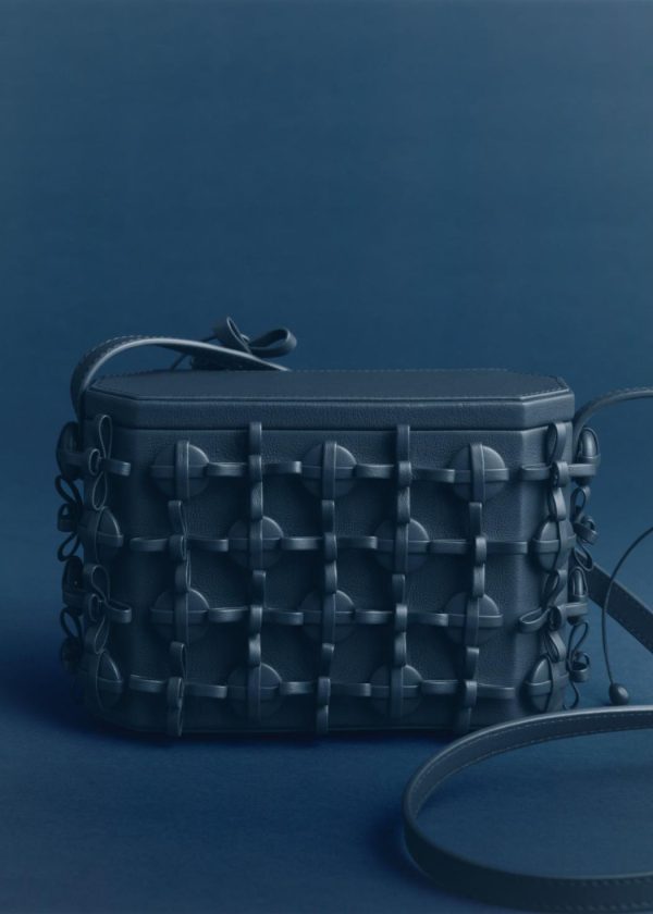 Sculptée avec précision dans le bois, sa forme dessinée est gainée d’un cuir de veau nappa par des artisans, avant d’être ornée de soixante-quatre boutons et nœuds cousus à la main. La bandoulière est ornée de gouttes ovales retenues par des nœuds.