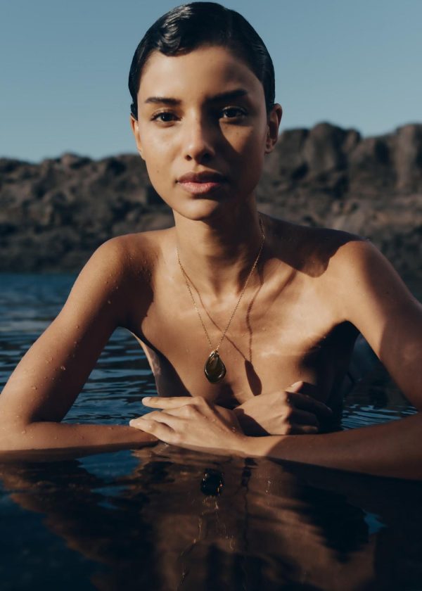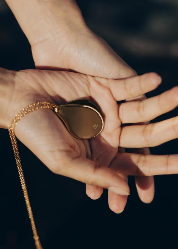 Un pendentif retenu par une fine chaîne superpose une goutte sculptée dans le verre et une plaque en laiton dorée, dévoilant par transparence le logo Polène gravé dessus.
