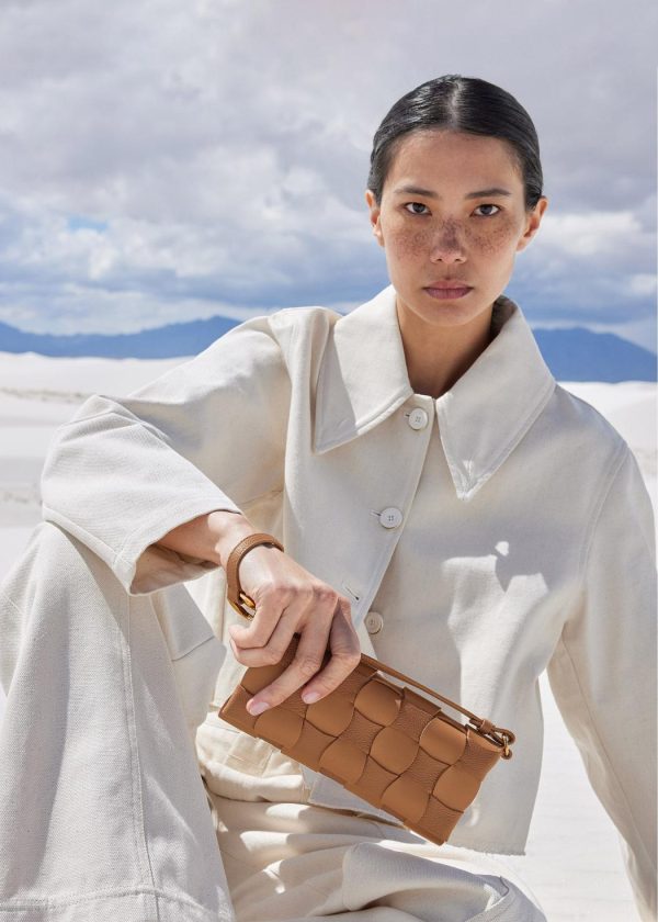 Le modèle Neiti réinterprète une technique iconique de la maroquinerie, le tressage, en l’adoucissant aux travers de lignes ondulées comme des vagues et en entrecroisant des cuirs ton-sur-ton lisse et grainé. Un savant jeu de pliage donne à ce mini-sac sa forme et son volume.