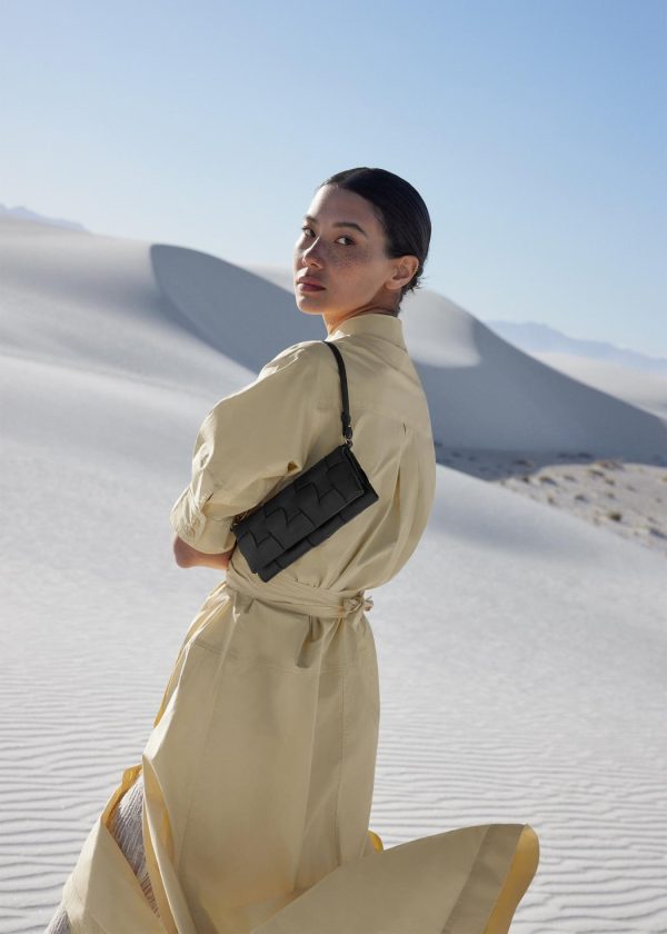 Le modèle Neiti réinterprète une technique iconique de la maroquinerie, le tressage, en l’adoucissant aux travers de lignes ondulées comme des vagues et en entrecroisant des cuirs ton-sur-ton lisse et grainé. Un savant jeu de pliage donne à ce mini-sac sa forme et son volume.