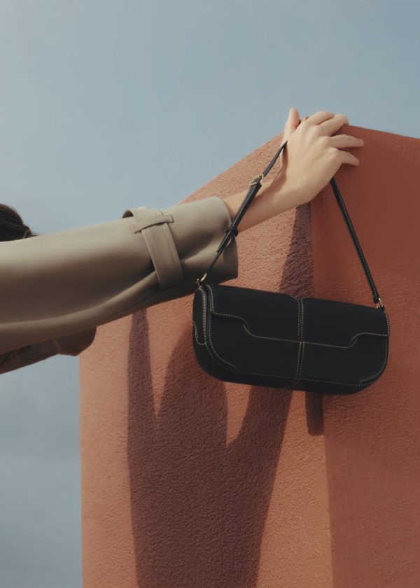 Fermé par un rabat, cet écrin est coupé dans un cuir de veau lisse, nappa. Réputé pour sa beauté naturelle et son toucher singulier, il revêt l’intérieur et l’extérieur du sac. La bandoulière réglable permet un porté court, « baguette ».